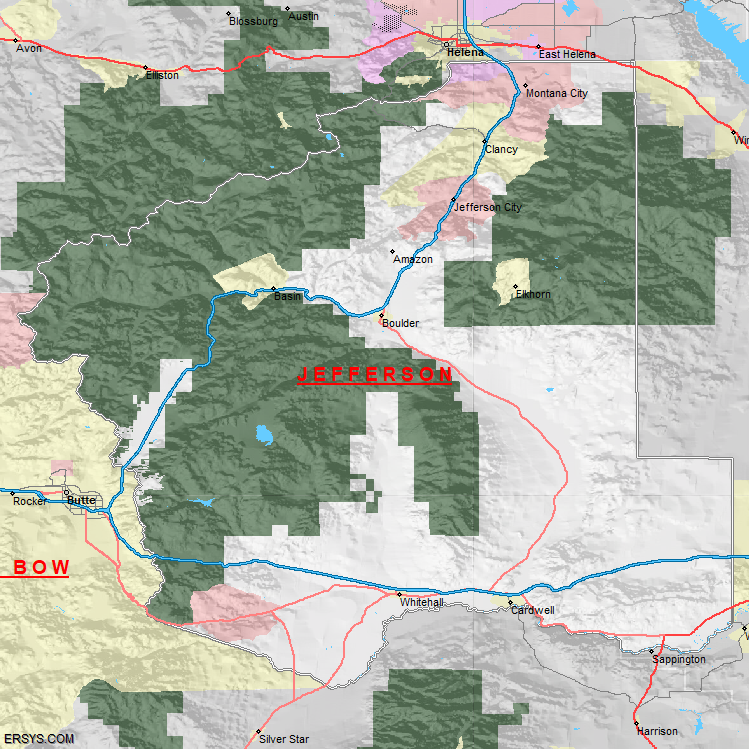 Jefferson County, MT (shown in white) has 1,657 mi² of land area and 2.42 mi² of water resources. The county is bordered by: