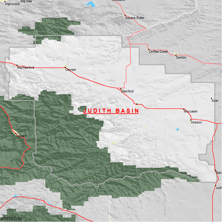 The estimated population of Judith Basin County is 2,021 with 910 households. These households are spread across 9 unique municipalties (not all shown).