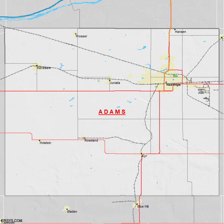 Adams County, NE (shown in white) has 563.27 mi² of land area and 0.96 mi² of water resources. The county is bordered by: