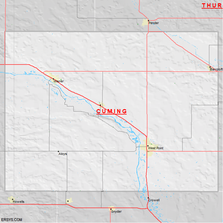 The estimated population of Cuming County is 9,069 with 3,698 households. These households are spread across 4 unique municipalties (not all shown).
