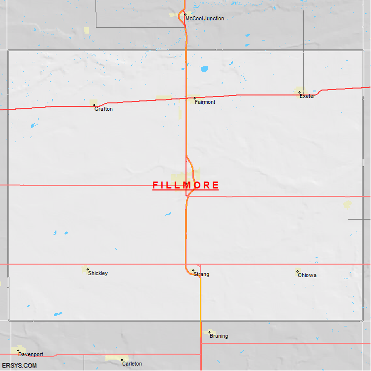 Fillmore County, NE (shown in white) has 575.37 mi² of land area and 1.15 mi² of water resources. The county is bordered by: