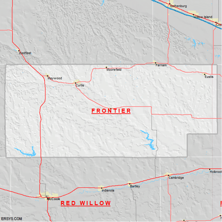 The estimated population of Frontier County is 2,551 with 1,062 households. These households are spread across 5 unique municipalties (not all shown).
