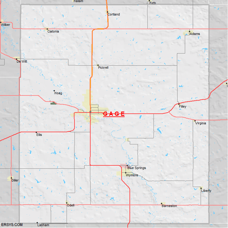 The estimated population of Gage County is 21,912 with 9,370 households. These households are spread across 13 unique municipalties (not all shown).