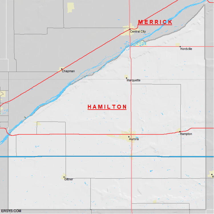 Hamilton County, NE (shown in white) has 542.11 mi² of land area and 2.63 mi² of water resources. The county is bordered by: