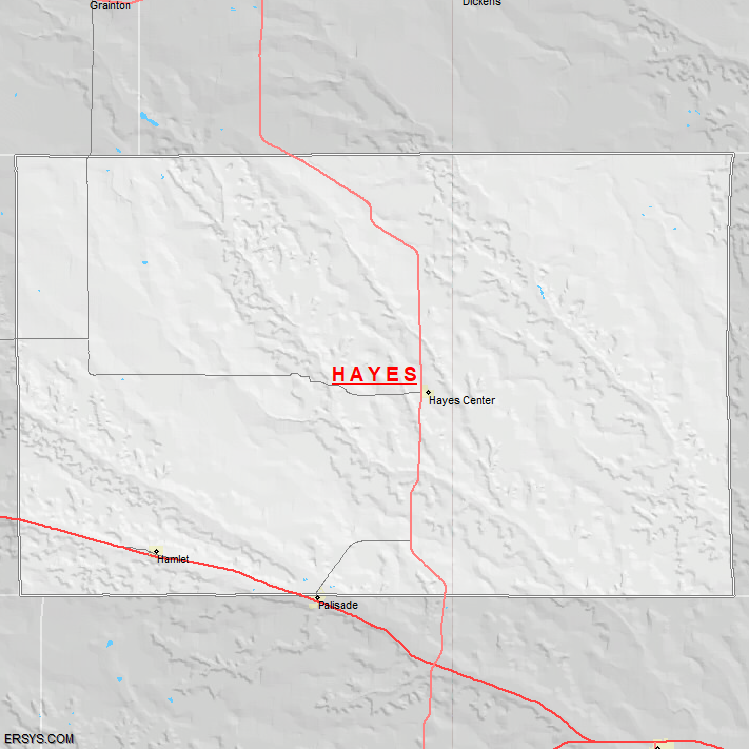 The estimated population of Hayes County is 852 with 352 households. These households are spread across 2 unique municipalties (not all shown).