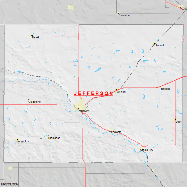 Jefferson County, NE (shown in white) has 570.18 mi² of land area and 5.49 mi² of water resources. The county is bordered by:
