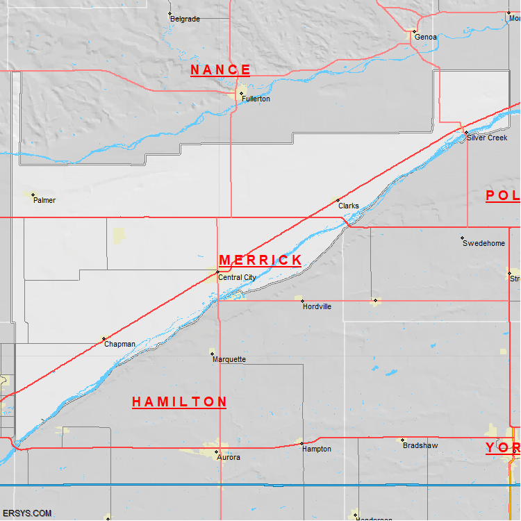 The estimated population of Merrick County is 7,851 with 3,147 households. These households are spread across 6 unique municipalties (not all shown).