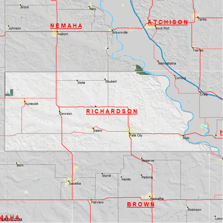 The estimated population of Richardson County is 7,875 with 3,464 households. These households are spread across 10 unique municipalties (not all shown).