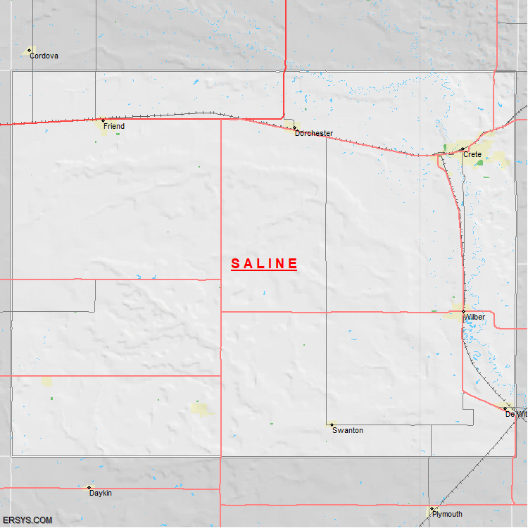 The estimated population of Saline County is 14,577 with 5,329 households. These households are spread across 8 unique municipalties (not all shown).