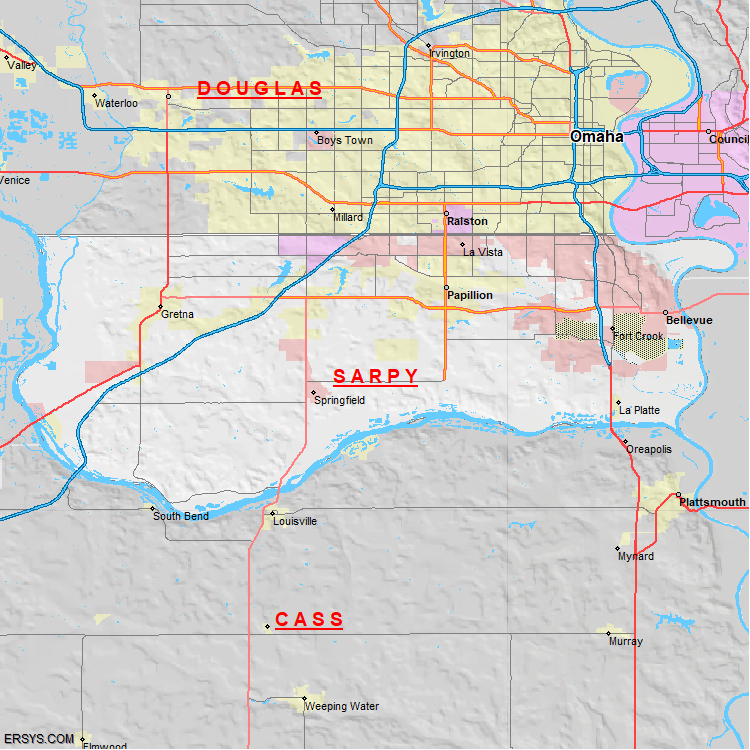 The estimated population of Sarpy County is 204,418 with 75,040 households. These households are spread across 12 unique municipalties (not all shown).