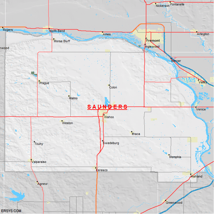 The estimated population of Saunders County is 23,608 with 9,191 households. These households are spread across 16 unique municipalties (not all shown).