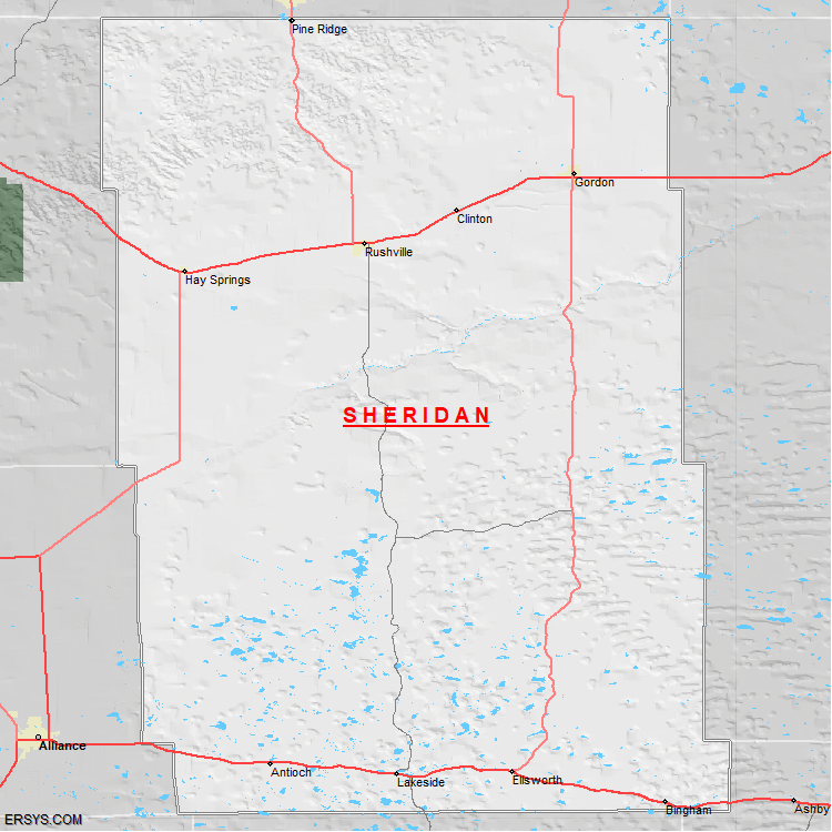 Sheridan County, NE (shown in white) has 2,440.88 mi² of land area and 28.85 mi² of water resources. The county is bordered by: