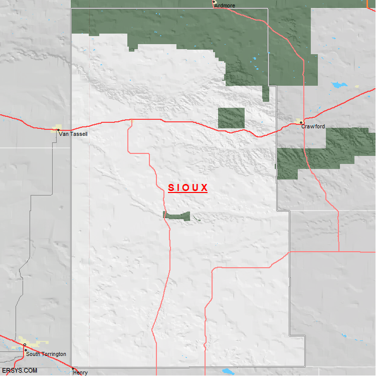 Sioux County, NE (shown in white) has 2,066.72 mi² of land area and 0.64 mi² of water resources. The county is bordered by: