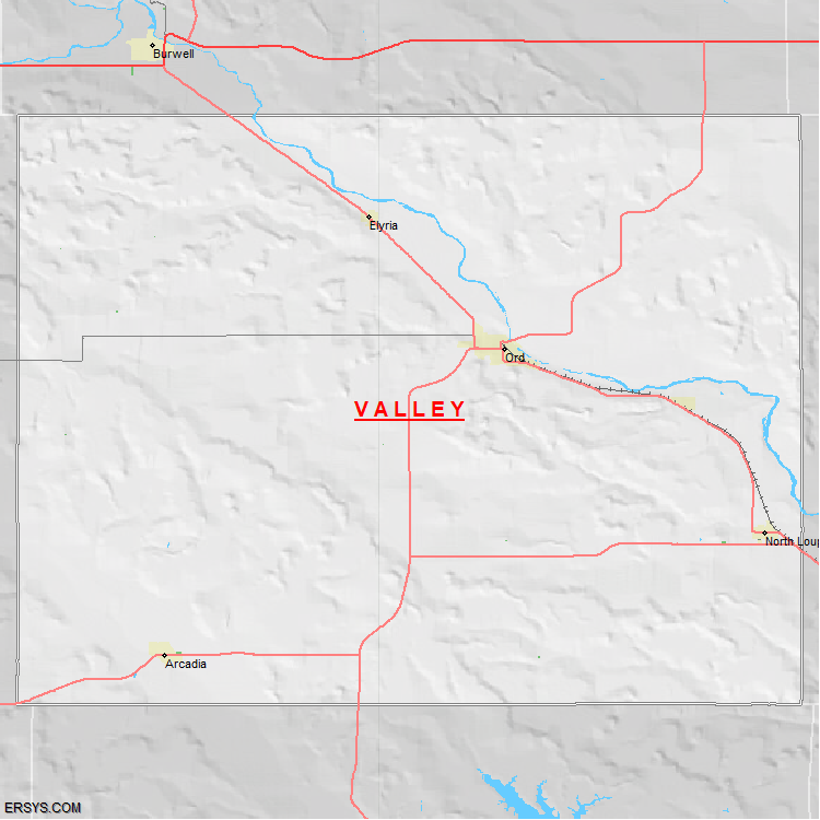 Valley County, NE (shown in white) has 568.11 mi² of land area and 2.35 mi² of water resources. The county is bordered by: