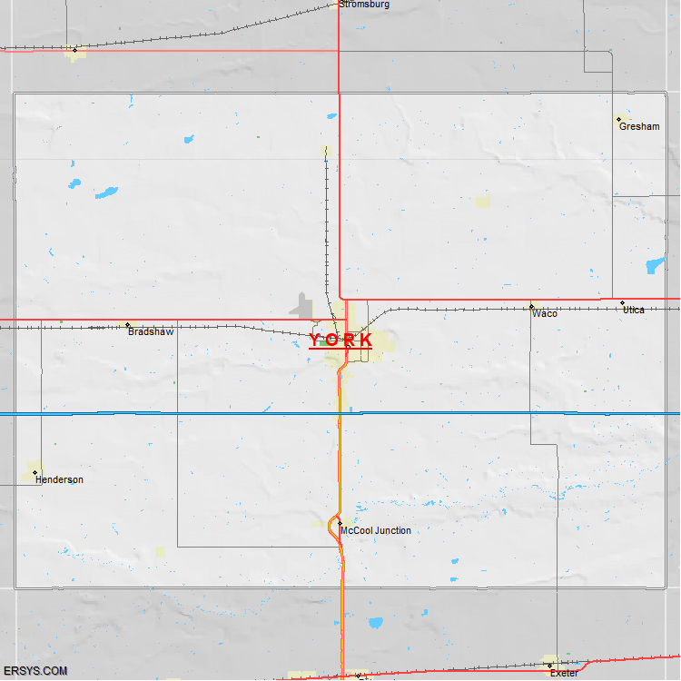 York County, NE (shown in white) has 572.51 mi² of land area and 3.32 mi² of water resources. The county is bordered by: