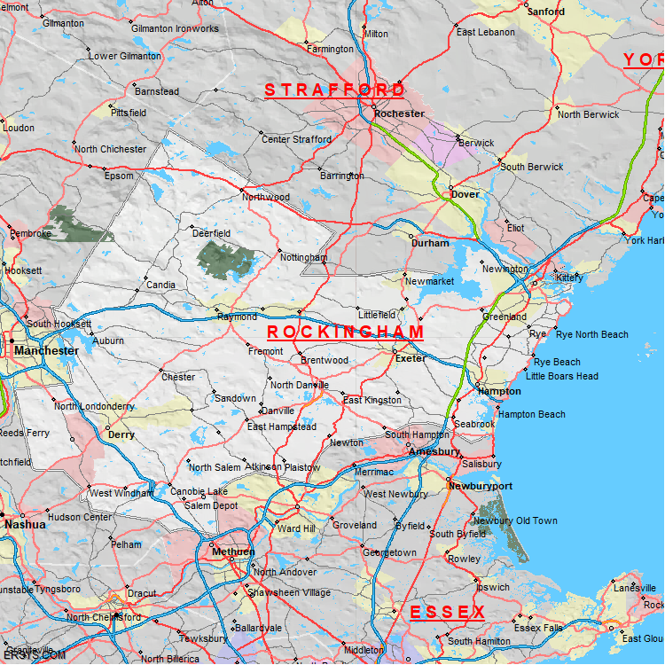 Rockingham County, NH (shown in white) has 695.39 mi² of land area and 99.86 mi² of water resources. The county is bordered by: