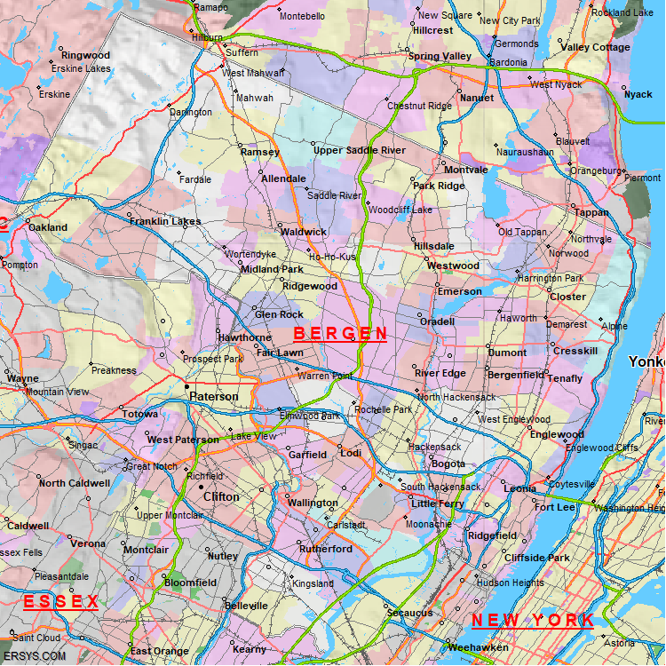 The estimated population of Bergen County is 970,590 with 356,536 households. These households are spread across 62 unique municipalties (not all shown).