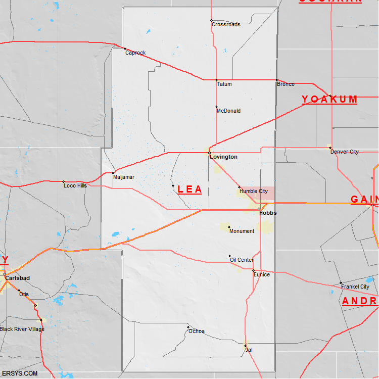 The estimated population of Lea County is 72,985 with 24,539 households. These households are spread across 8 unique municipalties (not all shown).