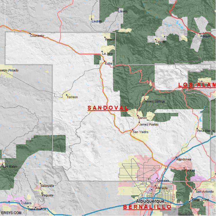 Sandoval County, NM (shown in white) has 3,710.19 mi² of land area and 4.19 mi² of water resources. The county is bordered by:
