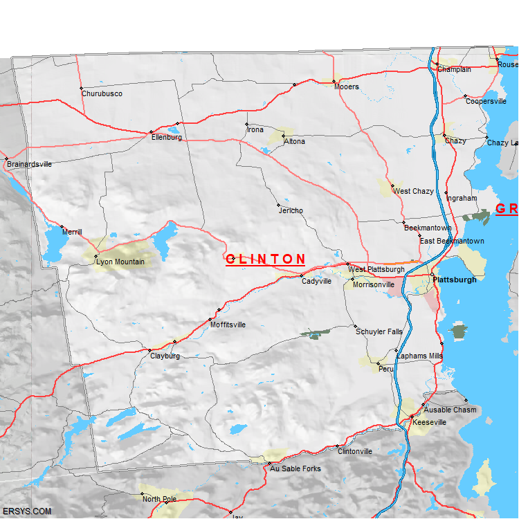 Clinton County, NY (shown in white) has 1,037.75 mi² of land area and 79.76 mi² of water resources. The county is bordered by: