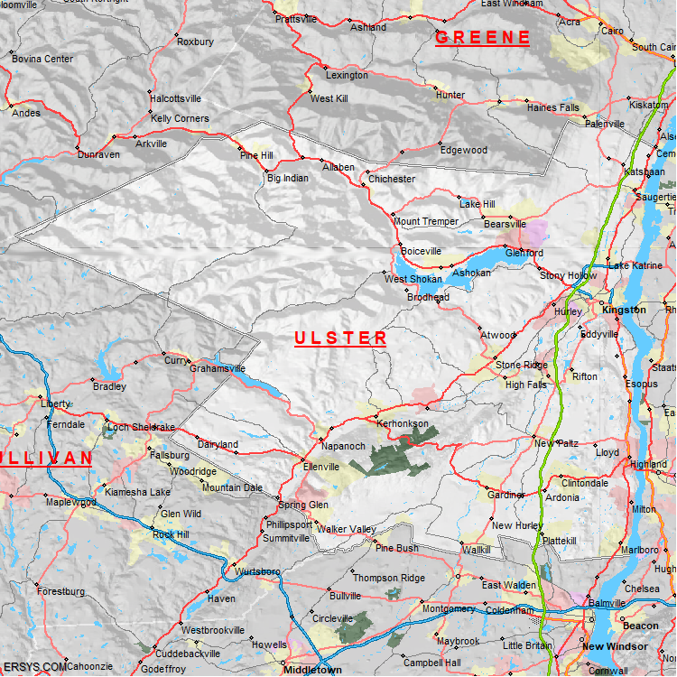 Ulster County, NY (shown in white) has 1,124.24 mi² of land area and 36.52 mi² of water resources. The county is bordered by: