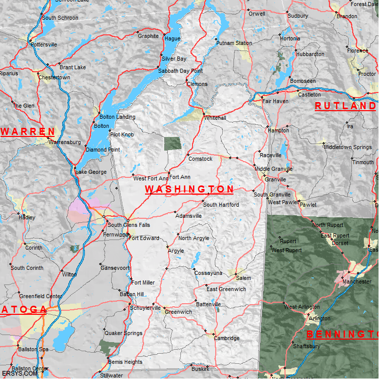 Washington County, NY (shown in white) has 831.19 mi² of land area and 14.72 mi² of water resources. The county is bordered by: