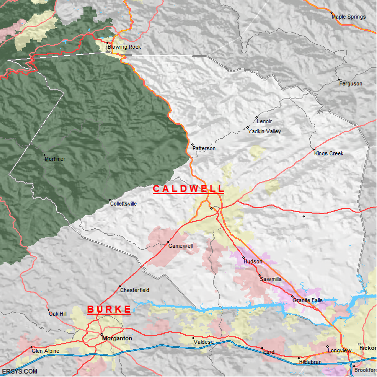 The estimated population of Caldwell County is 81,439 with 33,487 households. These households are spread across 8 unique municipalties (not all shown).