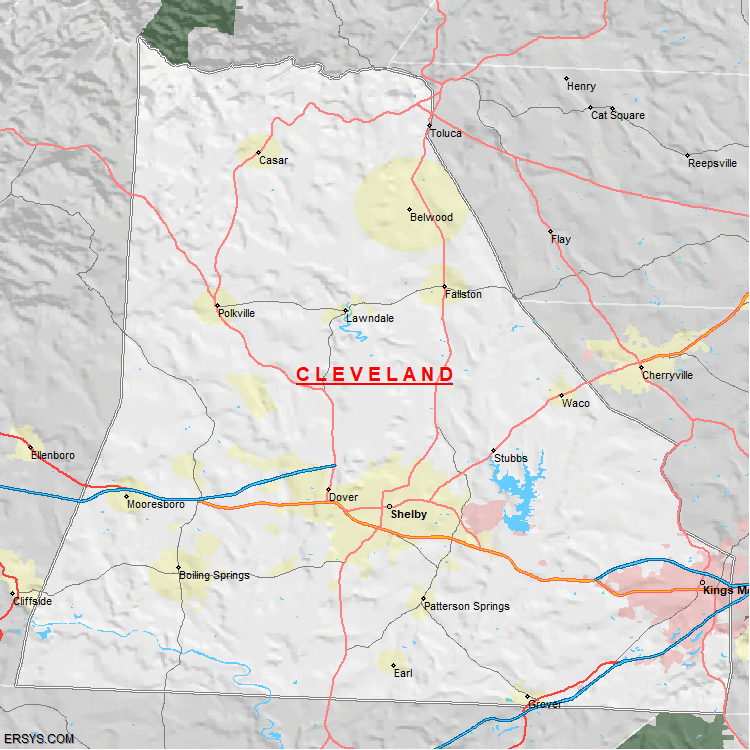 The estimated population of Cleveland County is 102,349 with 41,062 households. These households are spread across 16 unique municipalties (not all shown).