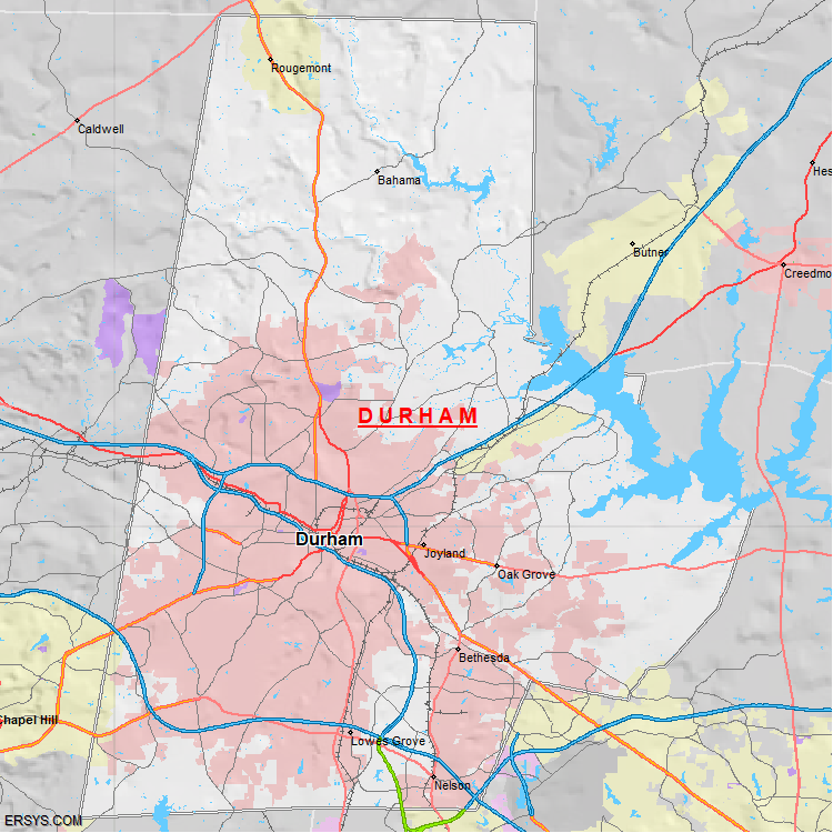 The estimated population of Durham County is 343,347 with 143,158 households. These households are spread across 3 unique municipalties (not all shown).