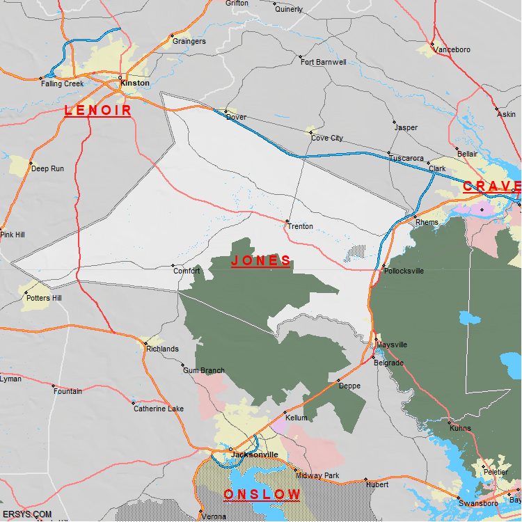 Jones County, NC (shown in white) has 471.37 mi² of land area and 2.33 mi² of water resources. The county is bordered by: