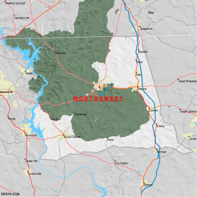 Montgomery County, NC (shown in white) has 491.54 mi² of land area and 9.99 mi² of water resources. The county is bordered by: