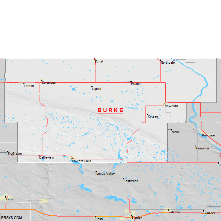 The estimated population of Burke County is 2,217 with 961 households. These households are spread across 7 unique municipalties (not all shown).
