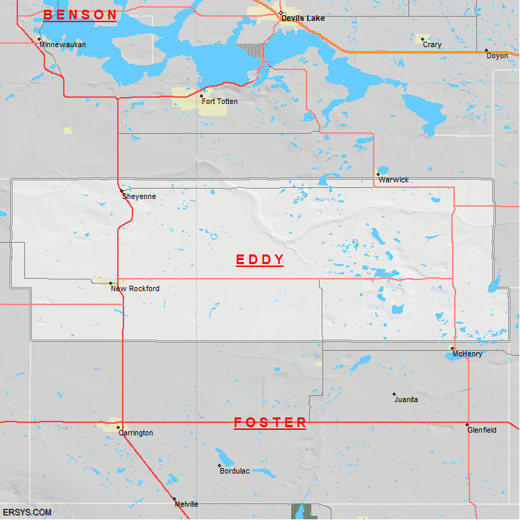 Eddy County, ND (shown in white) has 630.24 mi² of land area and 13.9 mi² of water resources. The county is bordered by: