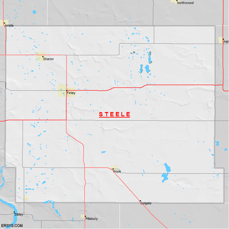 The estimated population of Steele County is 1,836 with 805 households. These households are spread across 4 unique municipalties (not all shown).