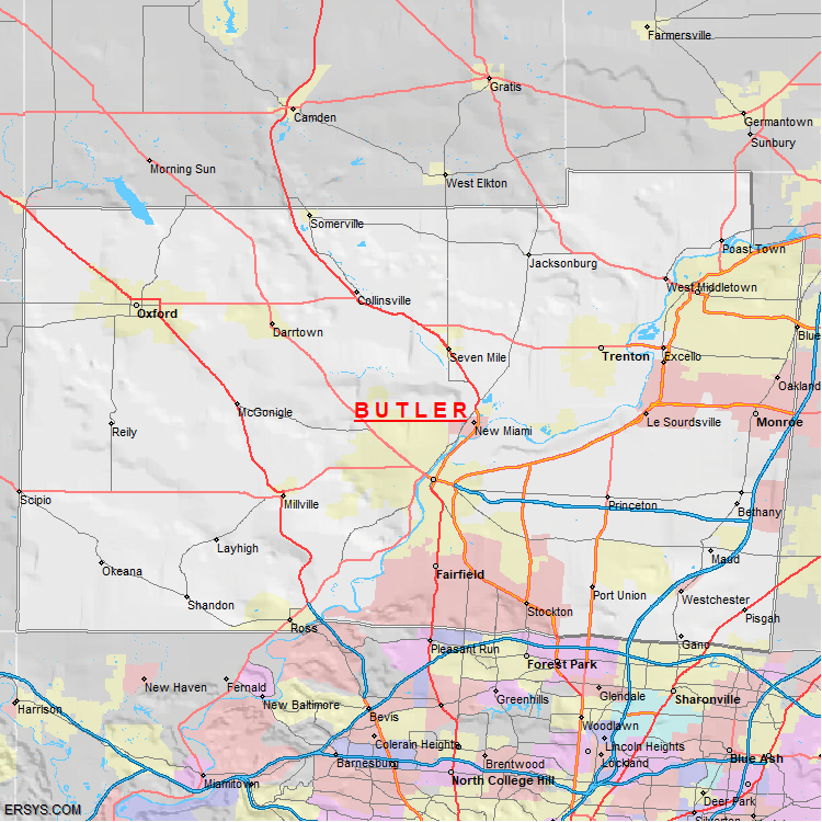 The estimated population of Butler County is 398,071 with 148,026 households. These households are spread across 19 unique municipalties (not all shown).