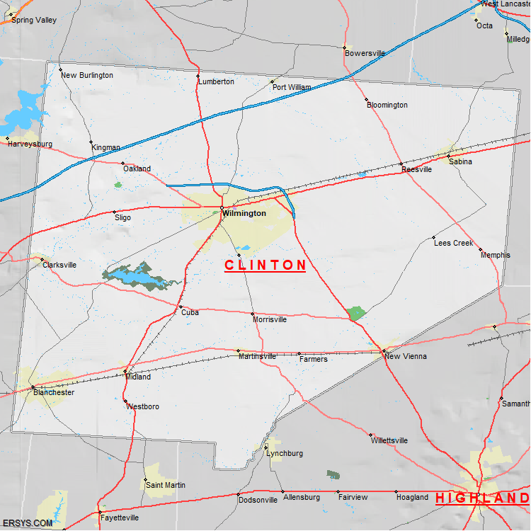 Clinton County, OH (shown in white) has 408.73 mi² of land area and 3.6 mi² of water resources. The county is bordered by: