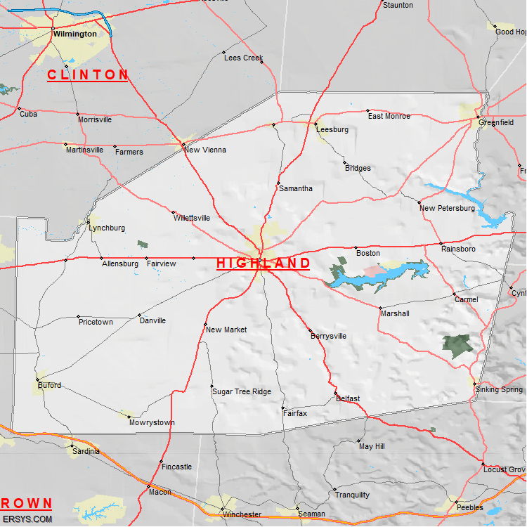 Highland County, OH (shown in white) has 553.08 mi² of land area and 4.71 mi² of water resources. The county is bordered by: