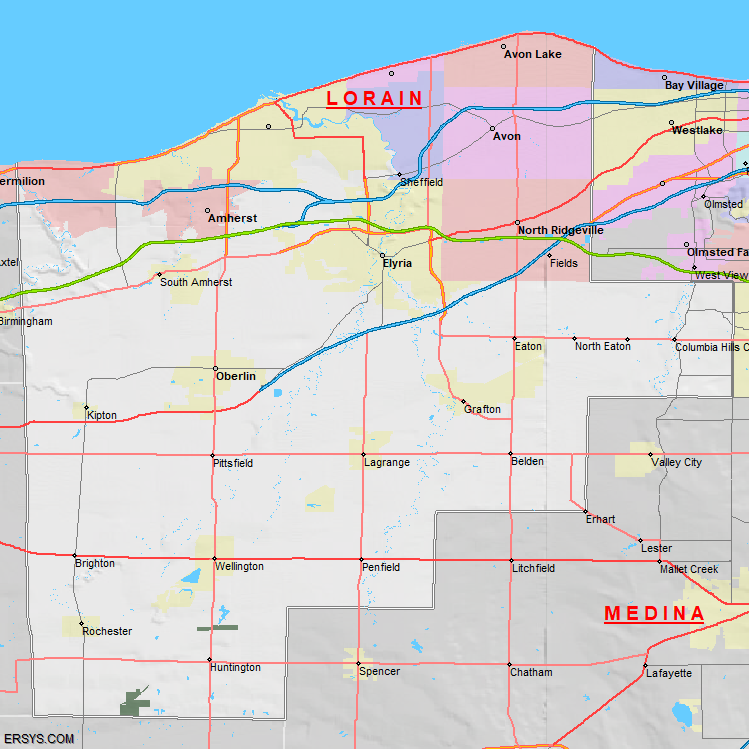 Lorain County, OH (shown in white) has 490.54 mi² of land area and 432.24 mi² of water resources. The county is bordered by: