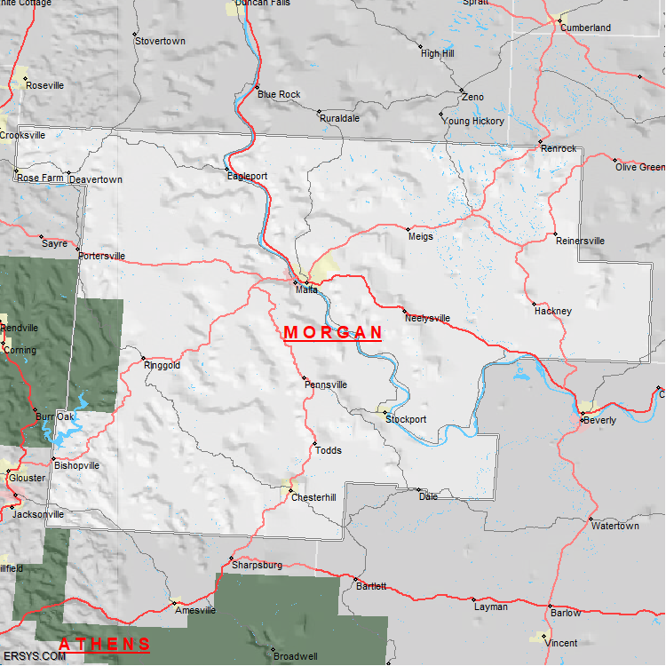 Morgan County, OH (shown in white) has 416.43 mi² of land area and 5.35 mi² of water resources. The county is bordered by: