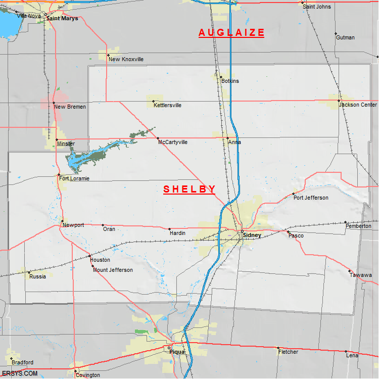 Shelby County, OH (shown in white) has 407.69 mi² of land area and 3.01 mi² of water resources. The county is bordered by:
