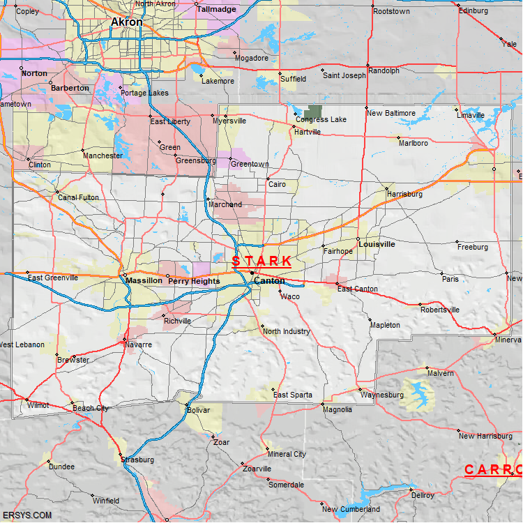 Stark County, OH (shown in white) has 575.19 mi² of land area and 5.27 mi² of water resources. The county is bordered by: