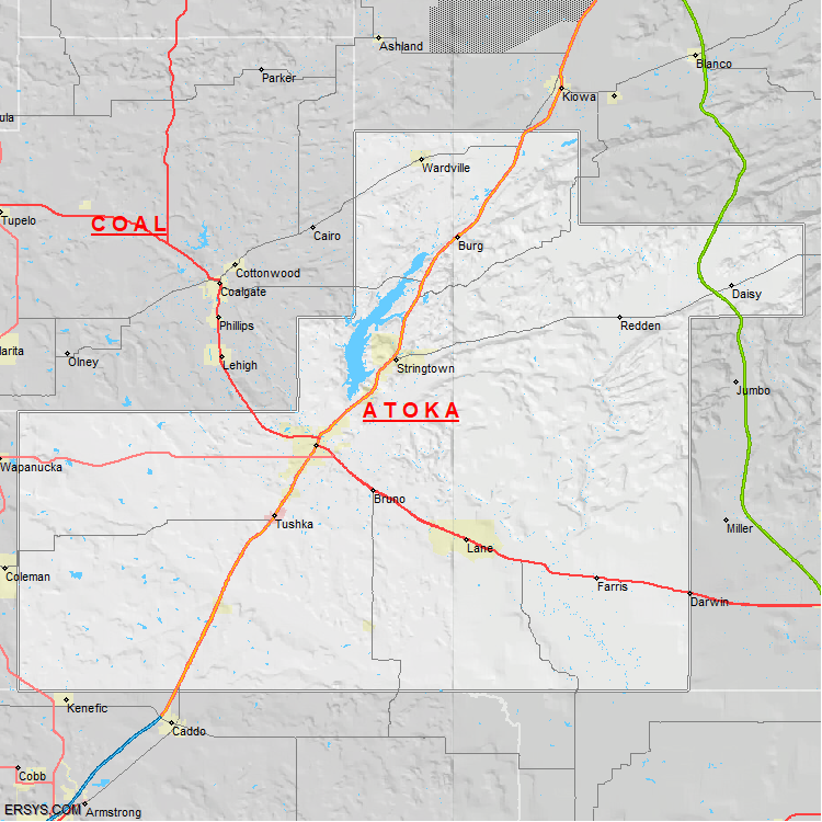 The estimated population of Atoka County is 14,617 with 5,229 households. These households are spread across 7 unique municipalties (not all shown).