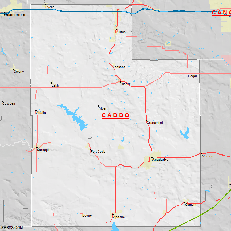 The estimated population of Caddo County is 27,378 with 9,459 households. These households are spread across 14 unique municipalties (not all shown).