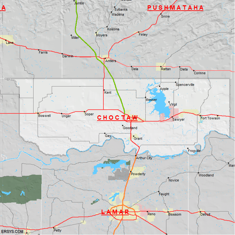 The estimated population of Choctaw County is 14,349 with 6,027 households. These households are spread across 7 unique municipalties (not all shown).