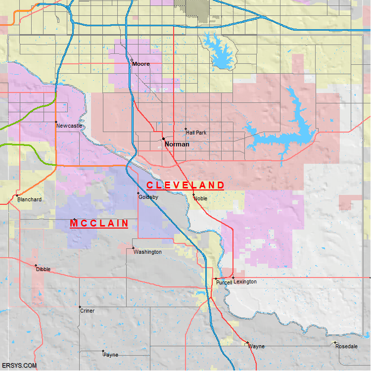 Cleveland County, OK (shown in white) has 538.89 mi² of land area and 19.02 mi² of water resources. The county is bordered by: