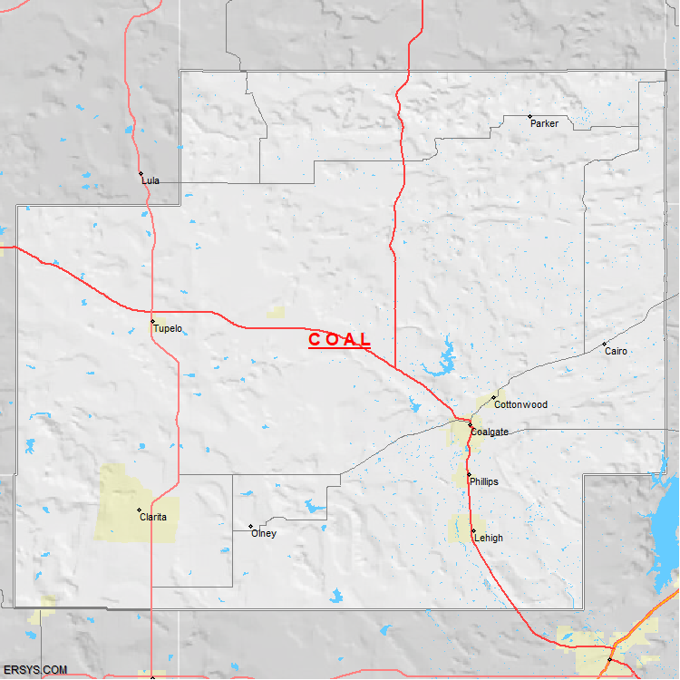 Coal County, OK (shown in white) has 516.77 mi² of land area and 4.66 mi² of water resources. The county is bordered by: