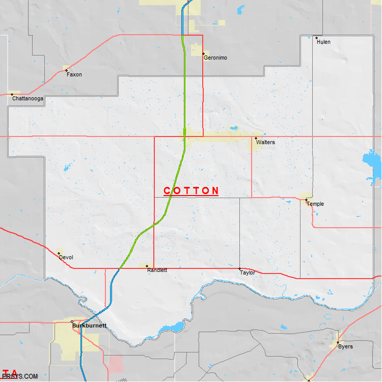 Cotton County, OK (shown in white) has 632.64 mi² of land area and 9.26 mi² of water resources. The county is bordered by: