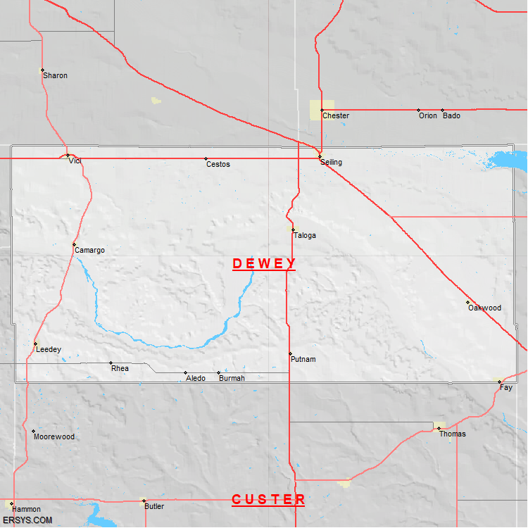 The estimated population of Dewey County is 4,455 with 1,728 households. These households are spread across 8 unique municipalties (not all shown).