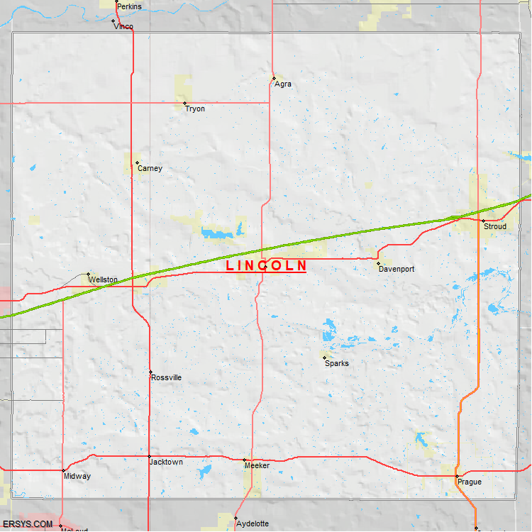 Lincoln County, OK (shown in white) has 952.37 mi² of land area and 13.41 mi² of water resources. The county is bordered by: