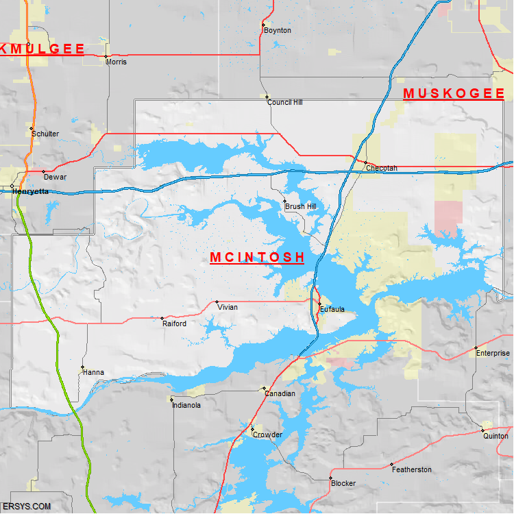 McIntosh County, OK (shown in white) has 618.29 mi² of land area and 93.77 mi² of water resources. The county is bordered by: